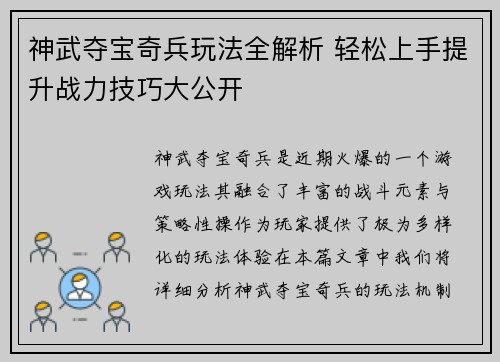 《神武夺宝奇兵》是近期火爆的一个游戏玩法,其融合了丰富的战斗元素与策略性操作,为玩家提供了极为多样化的玩法体验。在本篇文章中,我们将详细分析《神武夺宝奇兵》的玩法机制,并分享一些轻松上手、提升战力的小技巧,帮助新手玩家在游戏中快速进阶。在接下来的内容中,我们将从四个方面进行阐述:玩法基础介绍、装备系统解析、战力提升策略和常见技巧与心得。无论你是刚刚接触这款游戏的玩家,还是想要进一步提高自己战力的老玩家,相信本文的内容都将对你有所帮助。
