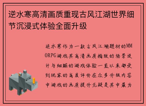 《逆水寒》作为一款古风江湖题材的MMORPG游戏,其高清画质、精致的场景设计与细腻的游戏体验,一直以来都受到玩家的高度评价。在众多升级内容中,游戏的画质提升无疑是其中最为引人注目的方面之一。随着技术的不断进步,《逆水寒》通过全面升级高清画质,进一步重现了古风江湖世界的美丽与细节,从而实现了一个沉浸式的游戏体验。在这篇文章中,我们将从多个方面探讨《逆水寒》高清画质重现古风江湖世界的细节提升,具体包括场景画质的极致呈现、人物造型与动作的精细打磨、环境互动与物理效果的提升,以及光影效果与天气系统的革新,全面展现其如何通过这些方面提升玩家的沉浸感。