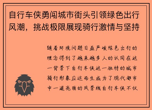 随着环境问题日益严峻,绿色出行的理念得到了越来越多人的认同。在这一背景下,“自行车侠”这一独特的城市骑行形象应运而生,成为了现代都市中一道亮丽的风景线。自行车侠不仅仅是为了挑战极限,更多的是借助自己的骑行行动,号召社会各界关注环保与健康,推动绿色出行的普及。本文将从四个方面对“自行车侠”如何勇闯城市街头,引领绿色出行风潮,挑战极限并展现骑行激情与坚持展开详细阐述,分别从绿色出行的环保意义、骑行激情的挑战性、极限骑行的坚持精神和社会影响的广泛性四个方面深入分析,揭示骑行运动如何成为现代城市生活的活力象征。